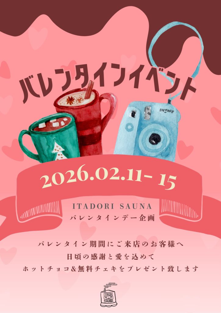バレンタインデーならではの特別なイベントですので、この機会にぜひITADORI SAUNAへお越しください!