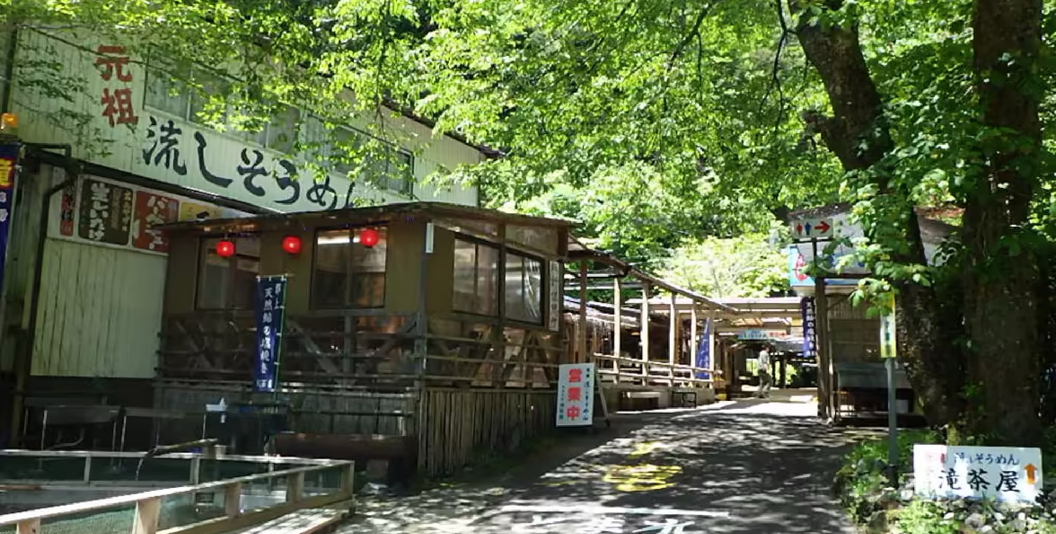 Enjoy nagashi-somen (flowing noodles) and fishing in a natural setting, surrounded by negative ions at Kamagataki Waterfall. BBQ is also available. Nagashi-somen is served year-round.