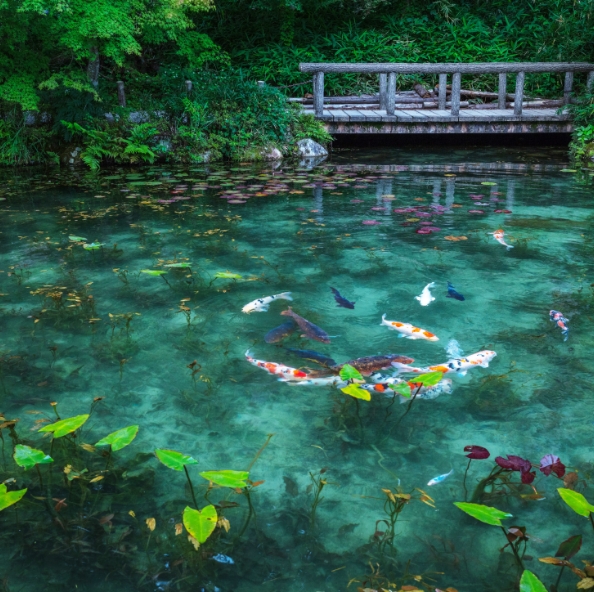 池水清澈,色彩鮮豔的鯉魚悠游其中,